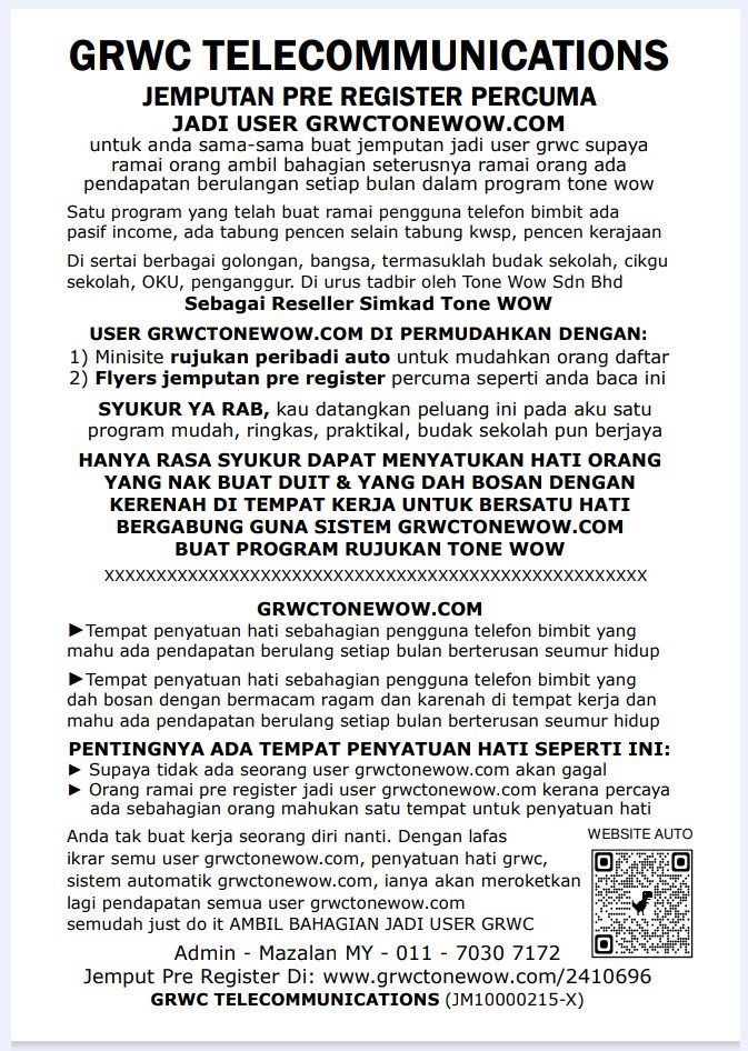 Pre Register sekarang untuk anda tahu lebih 18 sebab kenapa anda sekeluarga patut buat program rujukan tone wow seterusnya hidup anda sekeluarga lebih bermanfaat, lebih manis dan indah dengan tone wow Di member area di Bahagian 3, anda sekeluarga boleh uji dan rasai sendiri sistem grwctonewow.com boleh buat anda sekeluarga dan orang ramai boleh ada pendapatan berulangan setiap bulan dalam program rujukan tone wow seperti ahli tone wow yang lain bila adanya rasa syukur dan buat program rujukan tone wow Dengan jadi user grwctonewow.com, kerja kita jadi mudah. Lepas kita pre register jadi user grwctonewow.com dan buat program rujukan tone wow, kita edarkan flyers jemputan jadi user grwctonewow.com setiap hari secara konsisten walau di mana kita berada. Flyers jemputan kita akan bawa orang ramai ke minisite peribadi kita untuk dia pre register jadi user grwctonewow.com di minisite peribadi kita dan buat program rujukan tone wow guna ID TWE kita KESIMPULANNYA: Kita edar flyers jemputan, kerja santai-santai, boleh buat di mana sahaja bila-bila masa asalkan flyers jemputan ada di tangan, minisite rujukan peribadi kita buat penerangan untuk kita dan tempat orang pre register jadi user grwctonewow.com seterusnya mereka buat program rujukan tone wow guna id twe kita