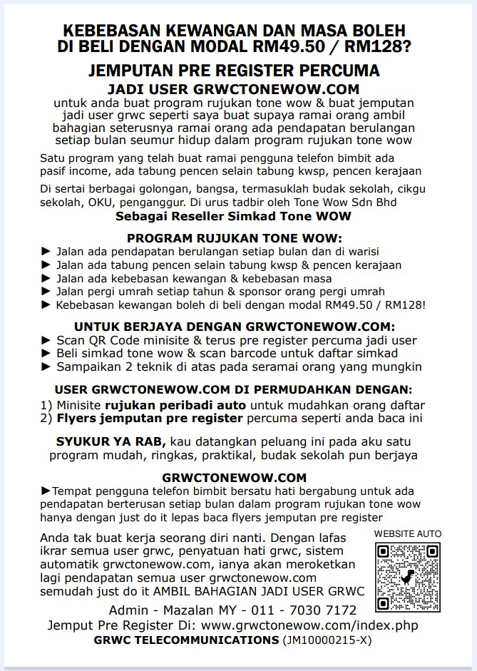 PERHATIAN: Untuk ahli tone wow sedia ada, anda juga boleh jadi user grwctonewow.com untuk anda pelbagaikan sumber promosi program rujukan tone wow anda dengan sekali bayaran RM100. RM70 untuk kos pengurusan, RM30 jariah anda admin letak di mana-mana masjid atau surau-surau. SILA WHATSAPP ADMIN: “NAK DAFTAR WEB”