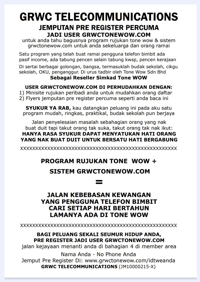 PRE REGISTER PERCUMA SEKARANG UNTUK ANDA: Jadi user sistem grwctonewow.com Ada minisite rujukan peribadi seperti anda baca ini Masuk ke dalam member area untuk lihat sendiri hebatnya program rujukan tone wow & bagusnya sistem grwctonewow.com Sertai program rujukan tone wow yang mudah, ringkas dan praktikal yang telah di sertai oleh berbagai golongan, bangsa, warganegara Bina jaringan rakan niaga program rujukan tone wow secara automatik Selesaikan masalah kebebasan kewangan yang anda cari setiap hari bertahun lamanya tapi dapat gaji sekadar untuk hidup bulan depan, untuk bulan seterusnya, dan seterusnya
