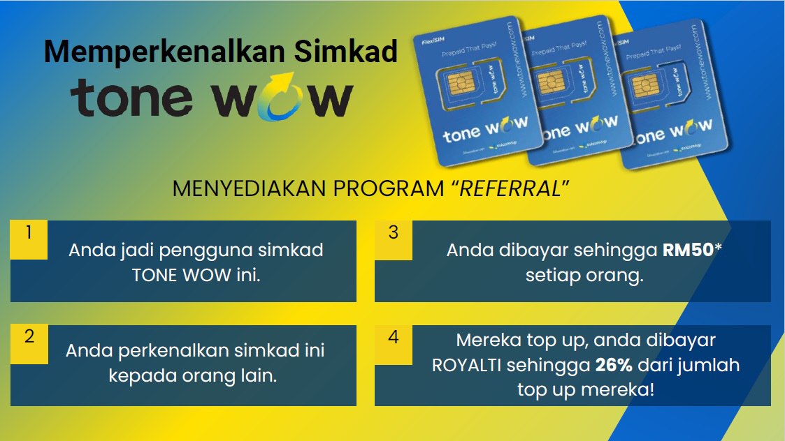 SATU PROGRAM ATAU BISNES YANG SANGAT SIMPLE, SATU PROGRAM YANG TELAH DI SERTAI OLEH PENGGUNA TELEFON BIMBIT DI MALAYSIA DARI BERBAGAI GOLONGAN, BANGSA, BUKAN WARGANEGARA TERMASUKLAH BUDAK SEKOLAH DAN CIKGU SEKOLAH SEBAGAI RESELLER SIMKAD TONE WOW YANG DI URUS TADBIR OLEH TONE WOW SDN BHD